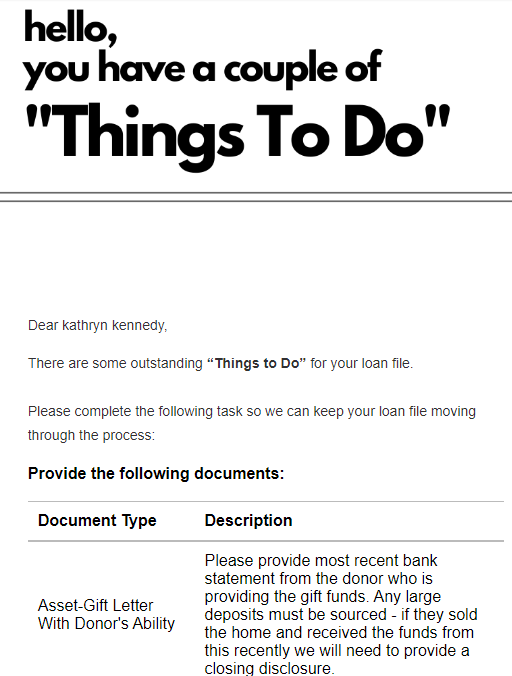 The processor will create a document request detailing the specific document needed to satisfy the conditions. They will then send out the Things to Do email to the borrower with the LO CC'd so the borrower can get to work. The Things to Do email provides a link for the borrower where they can easily upload the document needed into the correct document category.